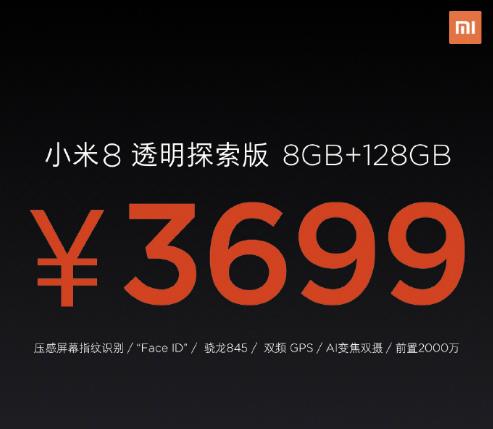 另外,小米8探索版配备是透明玻璃后壳,穿过后壳你可以清楚看到手机内部细节内容。小米8透明版只提供8GB+128G版本,售价为3699元,相比小米8起售价高出1000元。