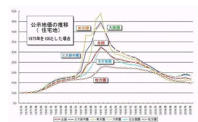 1991年,日本楼市最后一个辉煌时期彻底结束,从这一年开始,日本的楼市呈现断崖式下降,尤其是经济繁华的地区,住宅用地价格跌幅达80%左右,三四线城市也受到了影响,跌幅在50%以上。