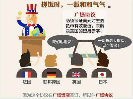 80年代美国的经济陷入衰退时期,贸易逆差增长过快,为了改变这一现象,美国联合日本、英国、德国等国家,签署了《广场协议》,其目的就是为了人工干预美元下降,减少美国贸易逆差,逼迫日元升级。