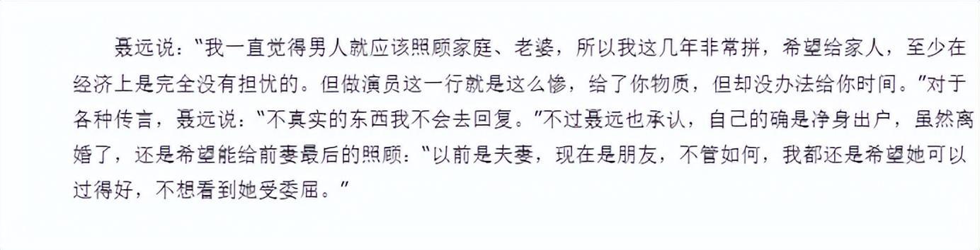 其实,聂远在接受采访时曾经说过:把房子留给王惠,自己净身出户,只是因为他给得了王惠物质生活,却给不了王惠陪伴。