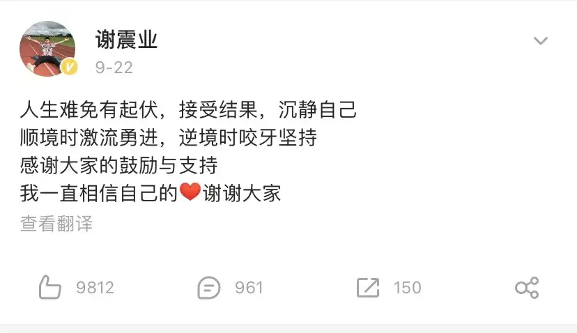 不过赛后谢震业对此却看得很开,他在社交媒体上发文,“人生难免有起伏,接受结果,沉静自己。顺境时激流勇进,逆境时咬牙坚持。感谢大家的鼓励与支持,我一直相信自己的。”