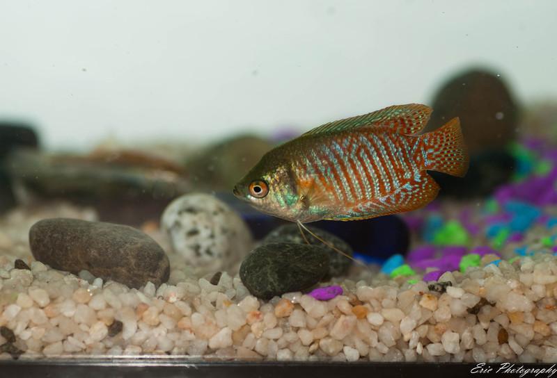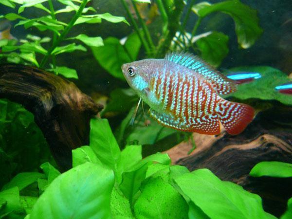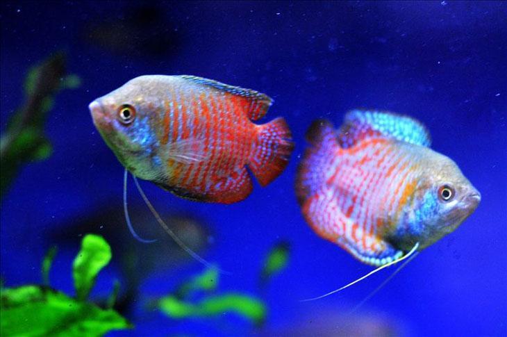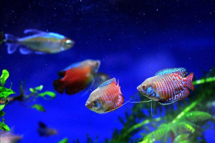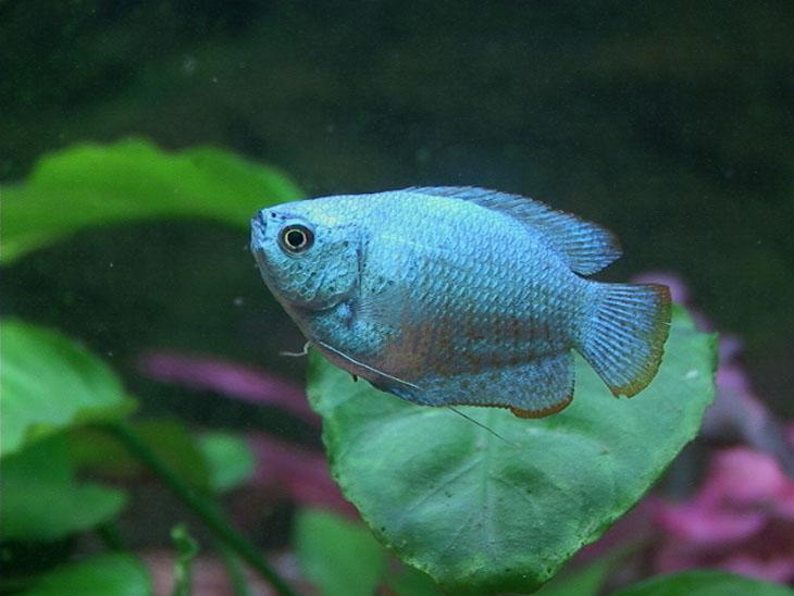 蓝丽丽鱼属于迷鳃鱼中强健的一种,在感到水中缺氧的时候会自动浮到水面吐泡呼吸氧气,所以不用担心因为缺氧而死亡。