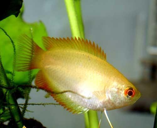 属于丽丽鱼中比较少见的一种,全身3/2的颜色为淡淡的金黄色,尾巴呈现红色,上鳍和腹鳍也会带有淡淡的红色,在接近尾鳍的部分也会带有稍稍的红色,看起来十分美丽,再加上大大的黑眼睛,又有一份可爱在其中,金丽丽鱼还有一点值得一提的就是它腹部的鳍丝,使得它看起来更加的完美。