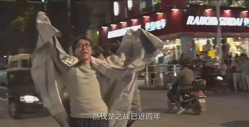 他赤着脚裹着床单,在夜晚的车流中踉踉跄跄,口中念叨着再也无法出现在电视上的台词,“大王壮志豪迈,令臣下敬畏不已……”