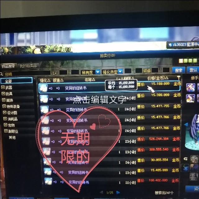 第三种拍卖行购买,拍卖行现在有一种无期限的和有期限的价格相差500万,无期限的最便宜,无期限的直接点开拍卖搜索(扭转)两个字,打(全程)出来的是有期限的贵五百万金币。