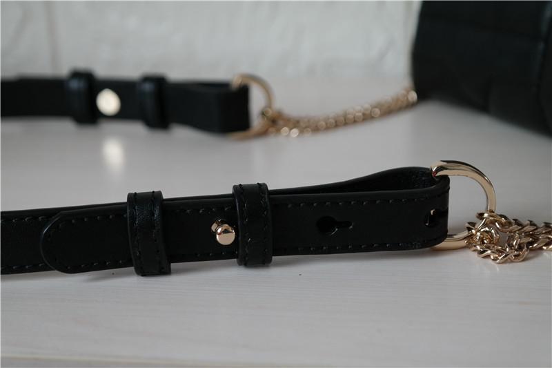 链条包是春夏款的主流,也是我的最爱,因为它可以尽显东方女性的妩媚与干练,只是有些链条包肩膀处会被勒疼,尤其是包里装了重物的情况下,有些链条包本身就重的厉害更不用提装什么东西了,而这款包包完全不会存在这些问题,链条与皮带的结合,既满足了形象的要求,又满足了舒适度,而且丝毫没有负重感。包包肩带长110mm,有3个扣眼,两侧分别有2个皮圈固定,不用担心多余的皮带部分时间长了会发翘。
