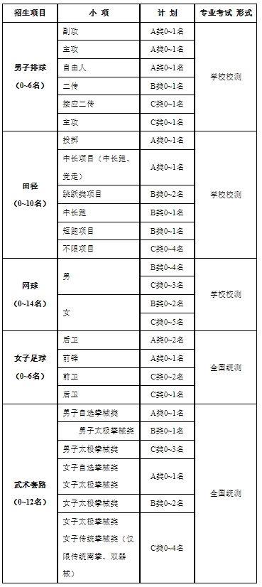招生项目有:男子排球、田径、网球、女子足球、武术套路。
