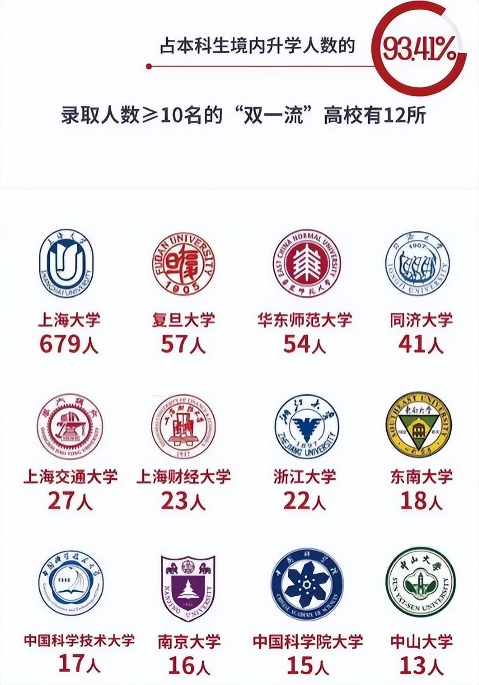 毕业生中选择继续升学的有1952人,境内升学的有1308人,包含本科生1153人,研究生155人。其中,1077名本科生就读于“双一流”高校,占本科生境内升学人数的93.41%;录取人数超过10名的“双一流”高校有12所。