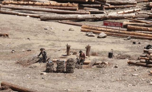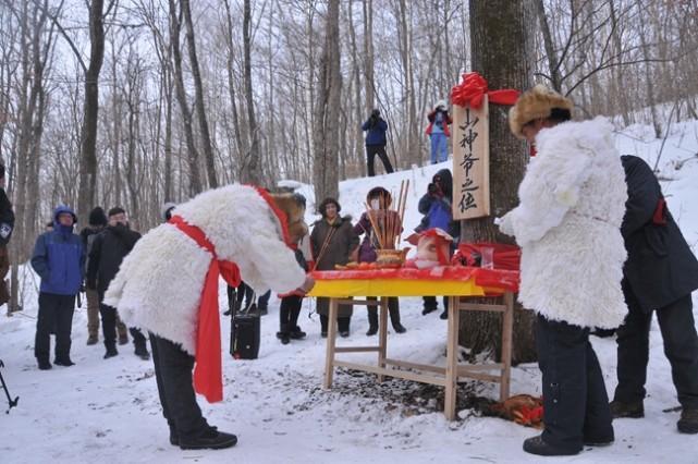 在伐木之前,必须先祭拜山神和树神,这是千百年来都不变的规矩。一般由把头带领,然后所有人跪地上磕三个头,同时把头嘴里念叨着一些吉祥的话,最后给树木系上红绳就可以正式砍伐了。还有,每年第一天上山伐木的时候,必须早上天不亮就出发,而且还要等放倒第一棵后才能吃饭,否则这一年伐木都不会有好的运气。在休息的时候,木把可以靠在树上,也可以坐在地下,但千万不能坐在砍伐后的树桩上,否则就是对树神的亵渎。