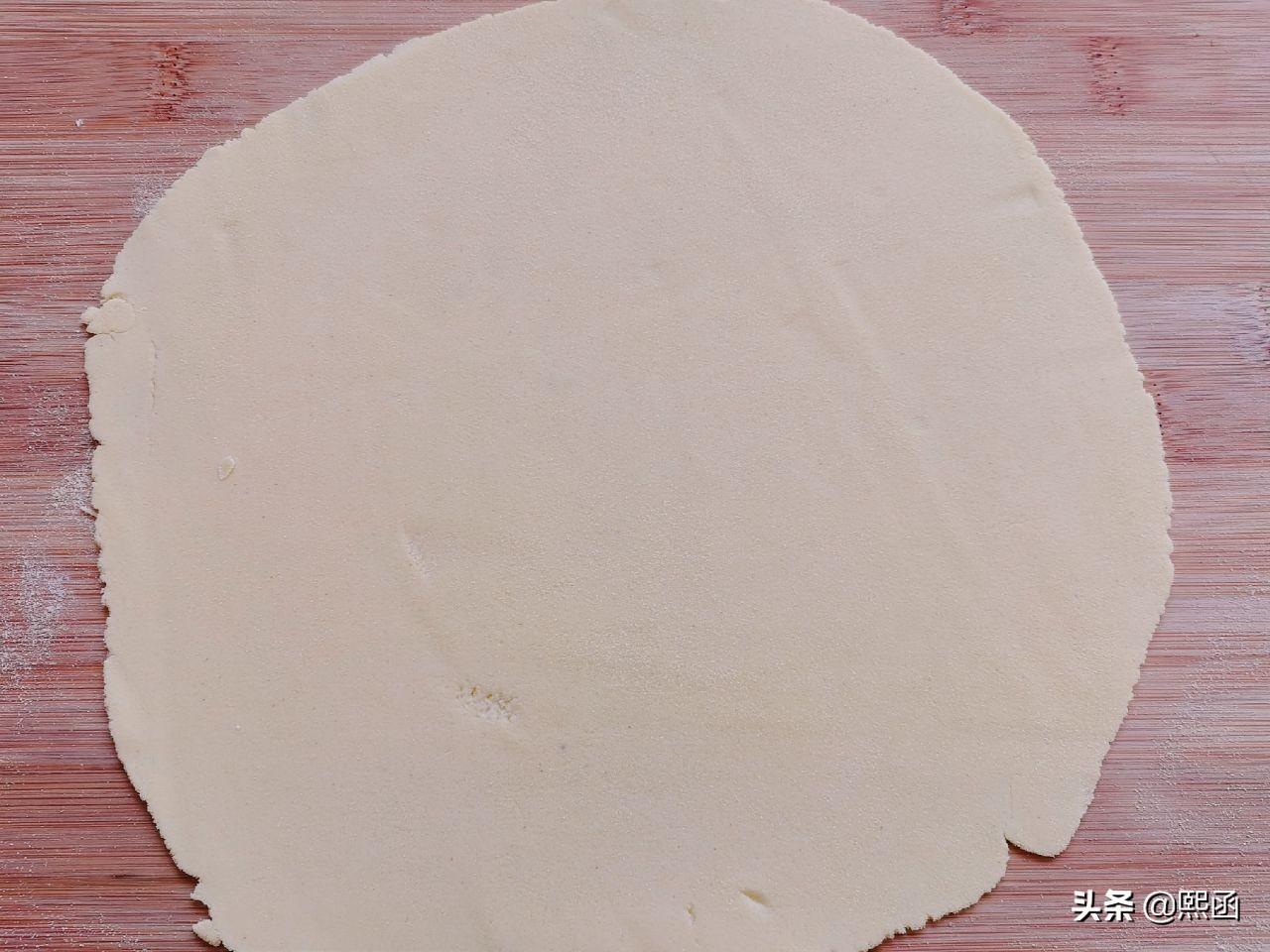 4、取一个小面团, 用擀面杖轻轻擀成圆形大薄饼,厚度在1毫米左右。玉米面团比较容易擀散,期间要多撒些干面粉防粘。