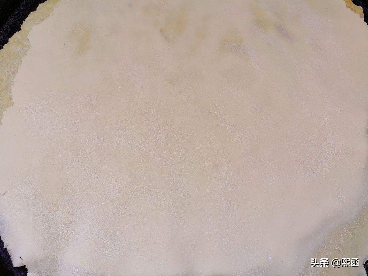 4、玉米面饼太薄容易粘锅,擀好后将其放在半熟的另一张饼上,就可以轻易移动了,可以轻松的调整面饼的位置。这样盖着烙也可以把下面的一张饼,烙的更酥脆。
