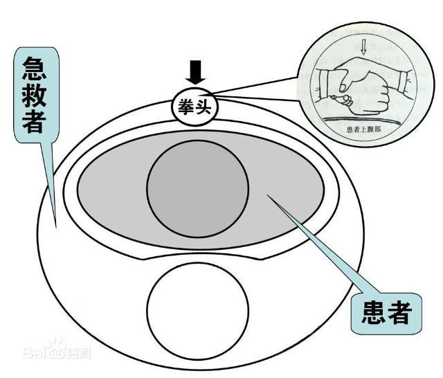急救者首先以前腿弓,后腿登的姿势站稳,然后使患者坐在自己弓起的大腿上,并让其身体略前倾。然后将双臂分别从患者两腋下前伸并环抱患者。左手握拳,右手从前方握住左手手腕,使左拳虎口贴在患者胸部下方,肚脐上方的上腹部中央,形成“合围”之势,然后突然用力收紧双臂,用左拳虎口向患者上腹部内上方猛烈施压,迫使其上腹部下陷。这样由于腹部下陷,腹腔内容上移,迫使膈肌上升而挤压肺及支气管,这样每次冲击可以为气道提供一定的气量,从而将异物从气管内冲出。施压完毕后立即放松手臂,然后再重复操作,直到异物被排出。