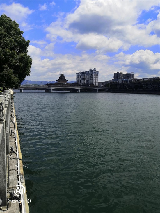 两岸自然风光与近几年修建的和平湖风光带及城市建筑群城水相融,和谐而畅达;龙津桥下,时而湖光粼粼,时而微波轻漾,桥礅旁湛蓝的深水表层,一条条手掌长的鱼儿正欢快地围着大桥石礅游来游去。