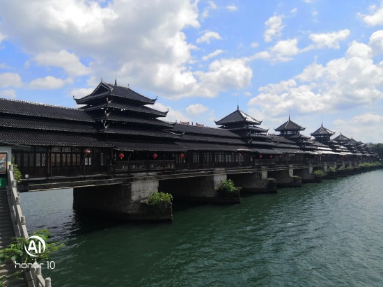 而两侧桥廊各店铺的设计和装饰,与整座廊桥的风格十分和谐,是现代园林建筑风格与侗乡本民族文化相互融合的最佳体现。桥两侧的桥廊檐有三层,桥楼凉亭檐有五层,上盖青蓝色琉璃瓦,瓦下配以白色瓦挡,层层叠叠,高高低低,远观近看都宛如闪烁着青蓝色光泽的龙鳞。桥廊与桥楼亭结构和谐,错落有致,廊下有亭,亭下又有廊。无数结构复杂的廊柱、木刻悬挂、枋、檩、凳、雕花栏杆等等,斜穿直套,纵横交织。整座廊桥看上去,翘角飞桅,层层叠叠,巍峨壮丽,气势恢宏,恍惚如仙楼琼阁。