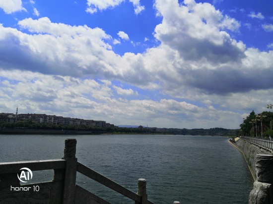 在风雨桥凉亭阁楼,抚木栏远眺,舞水两岸四面风光尽收眼中。北面青山远黛,明山叠翠;八百里舞水自贵州由西穿过十里芷江县城向东而去,河水拖蓝,碧波荡漾,蓝天白云与长长的舞水河交相辉映,好一幅气势磅礴、天水一色的美景;