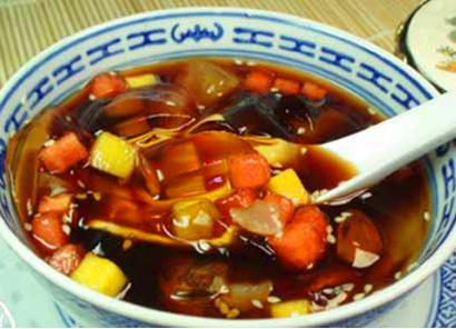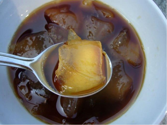 舀出凝结的冰粉,2勺红糖、小半碗酸梅汤(或白醋),开吃!