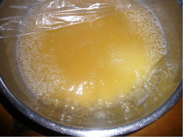 3.把劈荔水放到冰箱冷藏一晚,即凝结。