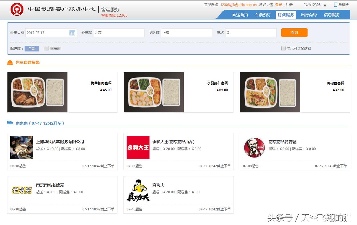 12306官网G1次列车订餐截图