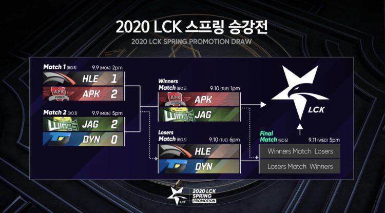 LCK联赛排名第九的HLE战队迎来CK联赛季后赛冠军APK战队的挑战(HLE战队主动选择APK战队);LCK联赛排名第十的JAG战队迎来CK联赛常规赛第一DYN战队的挑战(CK联赛常规赛第一自动获得一个升降级赛资格);赛制为BO3,随着APK战队爆冷2-1战胜HLE战队,JAG战队2-0战胜DYN战队,JAG战队和APK战队进入胜者组,HLE战队和DYN战队进入败者组,赛制为BO5。