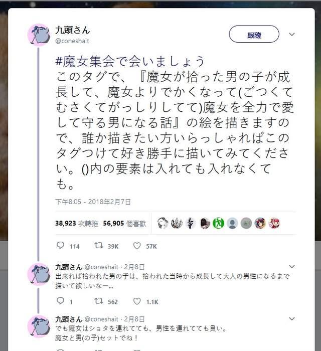 “请大家使用「魔女集会で会いましょう」这个标签画出「魔女捡到了一个小男孩,魔女照顾了一段时间后,已经变成了全力爱着魔女保护着魔女的大男人」大家都可以画!”