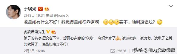 2月3日,于晓光转发了凌潇肃的微博,幽默调侃"凌品如有什么不好!我觉得品如很靠谱啊!不…咱叫凌瓷炫?"发微博还不忘撒狗粮,实力炫妻啊。