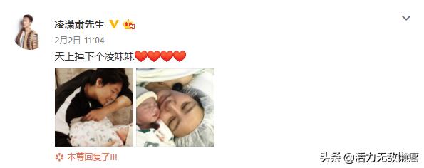 2月2日凌潇肃在微博宣布爱妻唐一菲产下了第二胎"凌妹妹",看照片满屏掩不住的幸福呢,恭喜凌潇肃儿女双全~