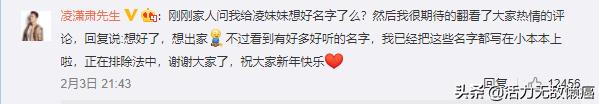 凌潇肃与2月3日晚在自己微博评论"刚刚家人问我给凌妹妹想好名字了么?然后我很期待的翻看了大家热情的评论,回复说:想好了,想出家不过看到有好多好听的名字,我已经把这些名字都写在小本本上啦,正在排除法中,谢谢大家了,祝大家新年快乐"。