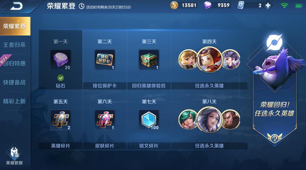 荣耀累登也就是玩家连续登录8天,就可以拿到全部的奖励了,而在第四天和第八天的时候,玩家可以获得一个永久英雄的奖励。这些英雄,小编大部分都有,都是一些老英雄,最新的自然是没有的。