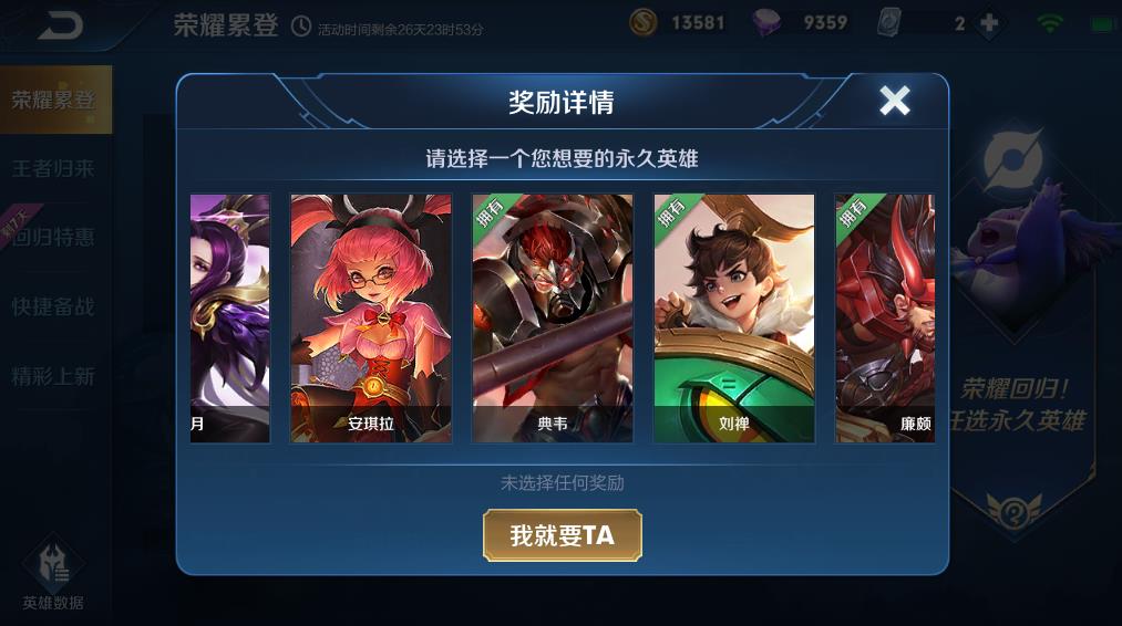 王者归来也是类似的任务,需要玩家每天登录才行,还要完成规定的任务,类似7天任务这样的设定,而最终的奖励也是一个永久英雄。小编这里选择了王昭君,这个英雄小编没有,早就想买个了,但又舍不得金币,这次总算不用纠结了。