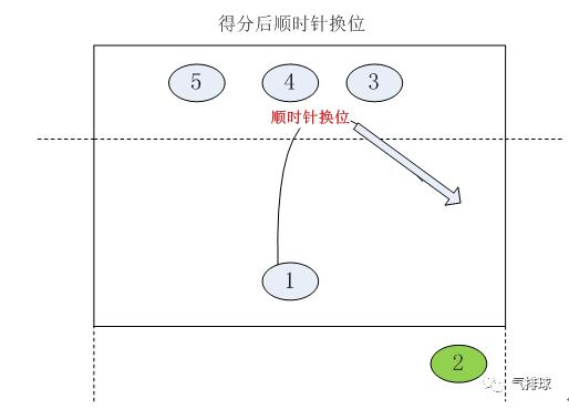 本方得分后,顺时针换位,由2号位队员轮转至1号位进行发球。