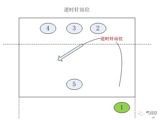 以下图为例,初始站位1号位队员发球,2、3、4号位队员站于网前篮网,5号位队员在后排准备防守,5名队员形成一个逆时针站位的阵型。