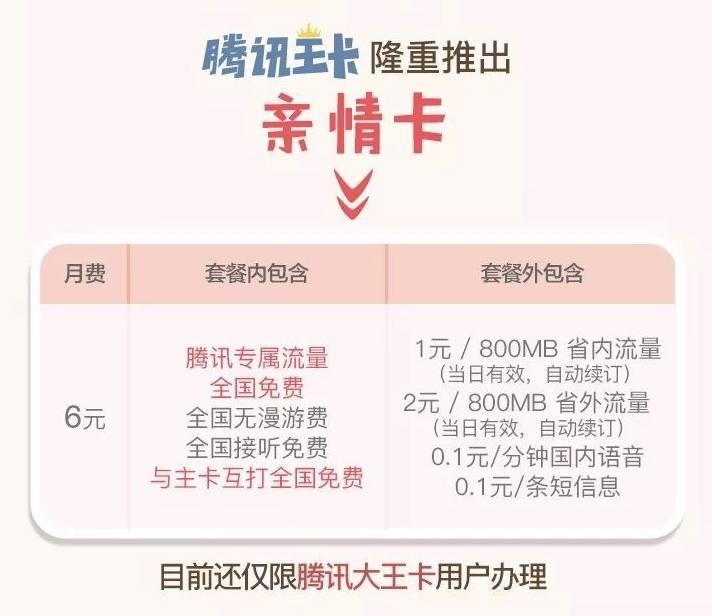 腾讯王卡亲情卡,月租为6元,套餐包含:全国无漫游费、全国接听免费、腾讯专属流量全国免费,其中与主卡互打全国免费,目前还仅限腾讯大王卡用户办理,套餐外包含:1元/800MB省内流量(当日有效,自动续订)、2元/800MB省外流量(当日有效,自动续订)、国内语音0.1元/分钟、短信0.1元/条。