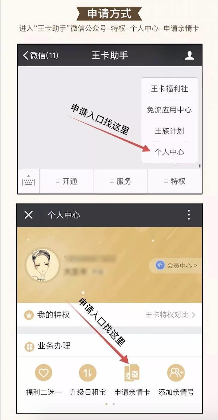 用户打开微信,搜索“王卡助手”,关注并点击打开:特权-个人中心-申请亲情卡