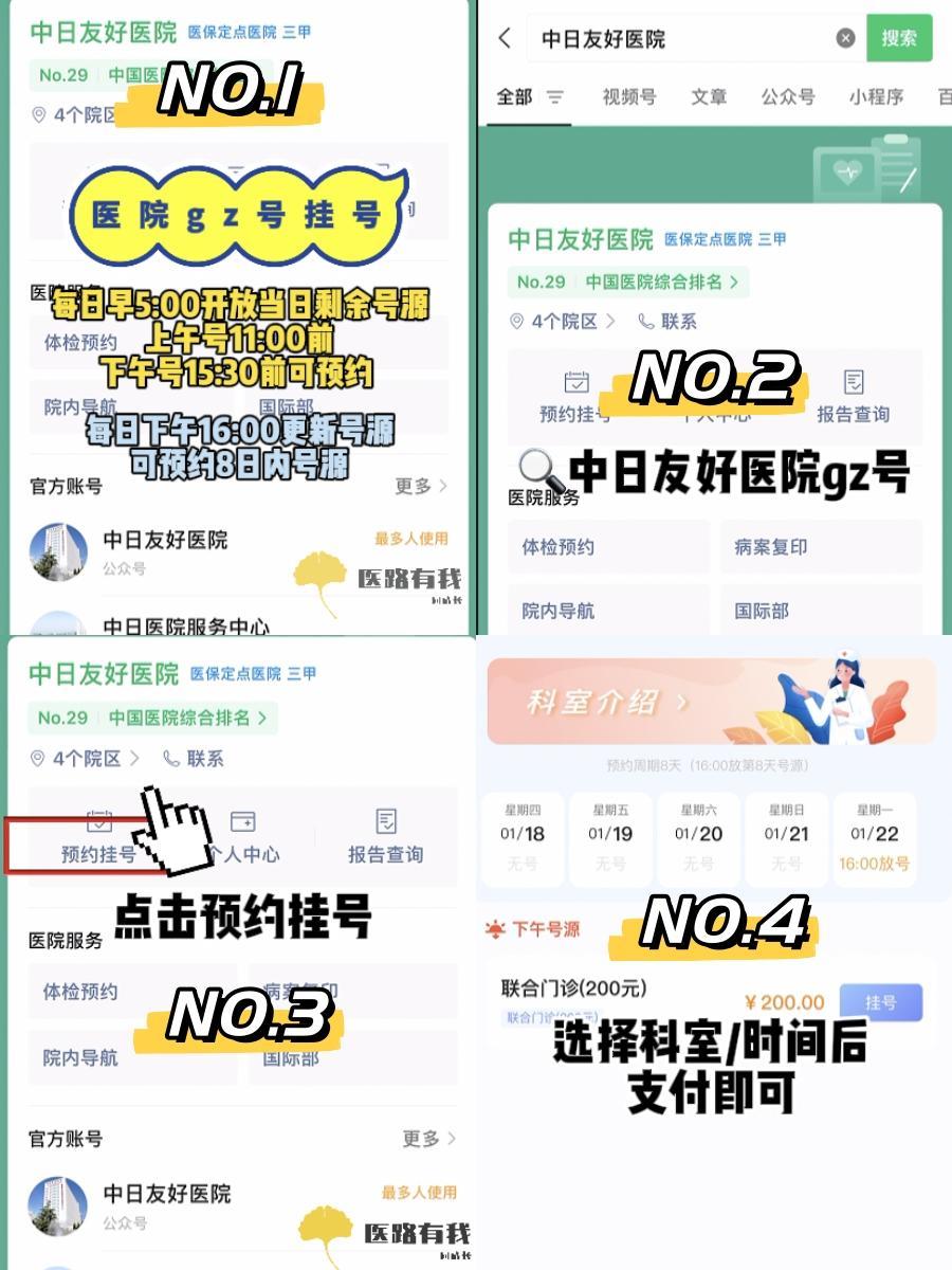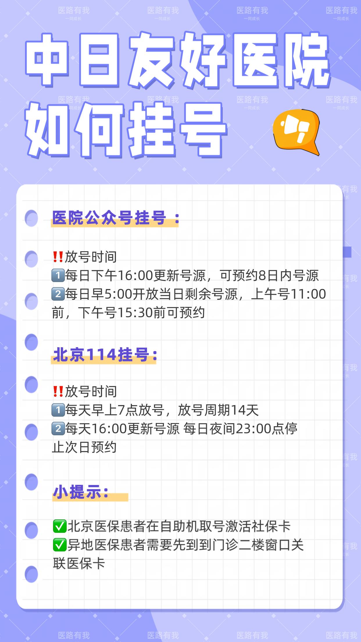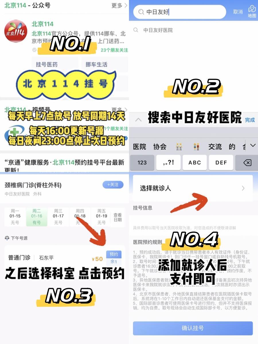 搜索北京114公众号,点击预约挂号,搜索中日友好医院,此平台每天早上7点放号,放号周期14天。之后选择科室,点击预约,添加就诊人后支付即可。(每天16:00更新号源。每日夜间23:00点停止次日预约)