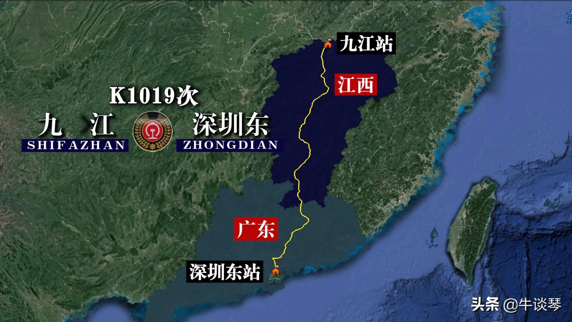 K1019次列车运行线路图:九江开往深圳东,全程1057公里