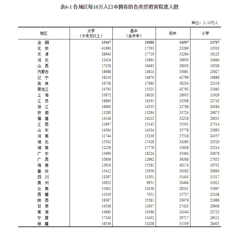 4、在受教育方面,每10万人口中拥有高中(含中专)教育的人数10568,初中教育人数24344,小学教育人数32725。