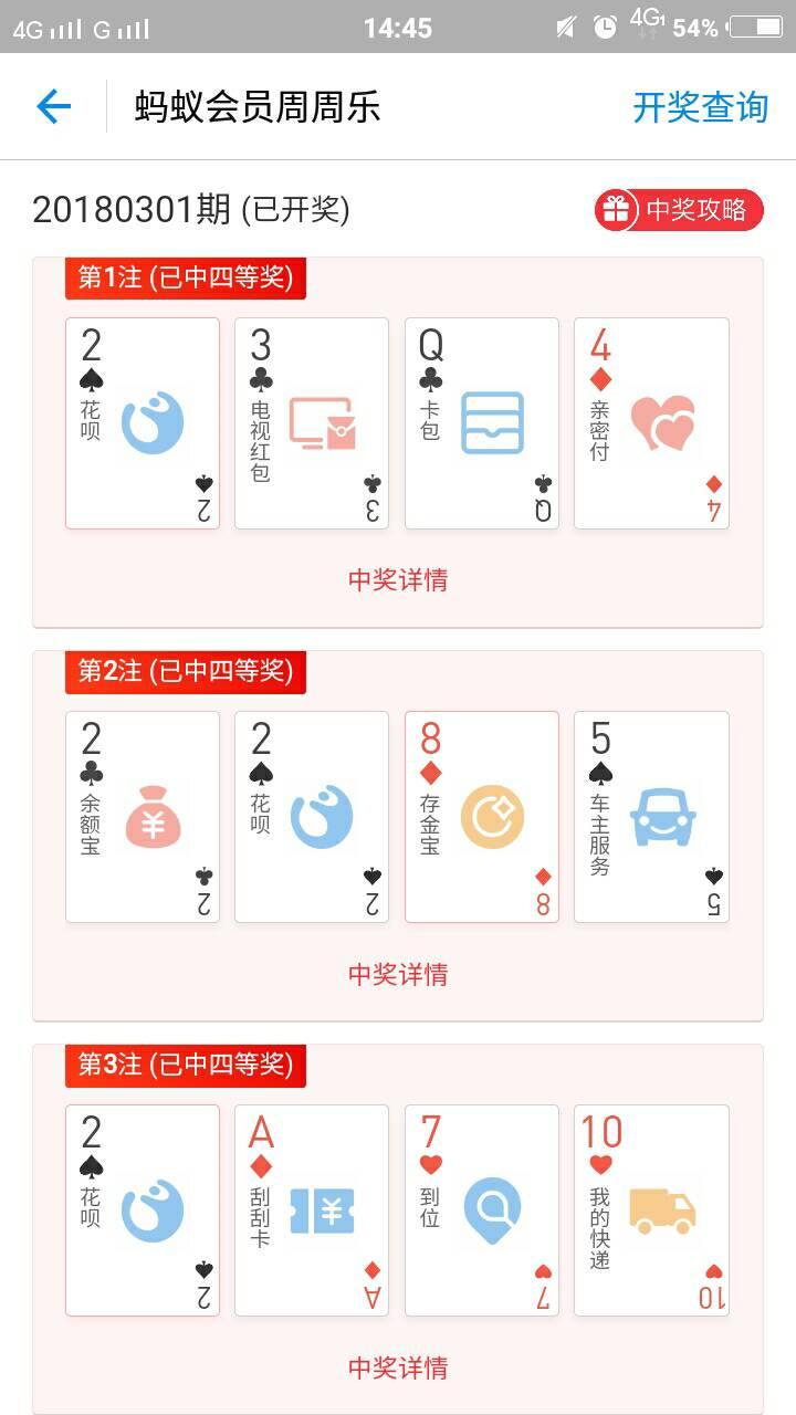 虽然都是四等奖,但是我觉得能中3组四等奖是很了不起的了,毕竟很多时候都是没有中奖的!不知大家中过奖没有?中过几等奖??