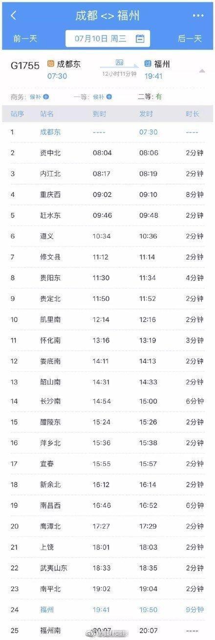 【7月10日,成都首开至福州高铁!】7月10日零时起,铁路开始实行新的运行图。此次调图后,成都将首开到福州的高铁,全程开行12个多小时,比此前动车节约近4个小时。(via 成都发布)