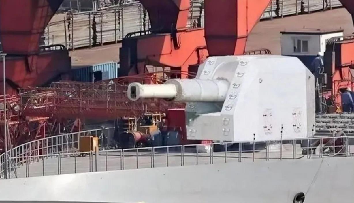 在图片中,我们可以看到C炮位上已经安装了1130型近防炮系统,而B炮位则配备了8座8联装64单元VLS装置,用于垂直发射多种导弹。 A炮位尚未安装,可能等待155mm电磁线圈炮的安装。