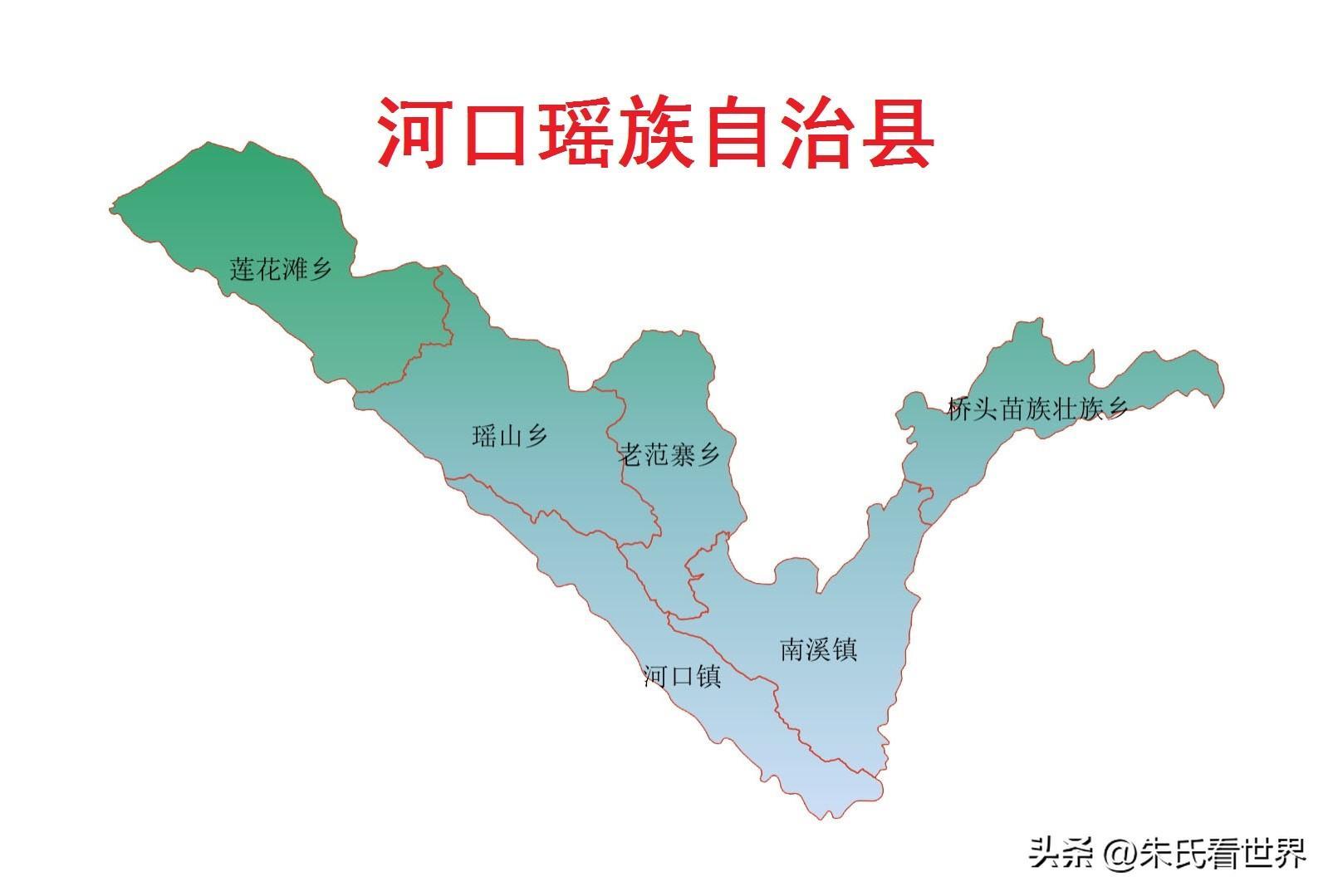 河口县总面积1332平方公里,下辖2个镇、3个乡、1个民族乡,即河口镇、南溪镇、老范寨乡、瑶山乡、莲花滩乡、桥头苗族壮族乡。根据第七次人口普查数据,截至2020年11月1日零时,河口瑶族自治县常住人口为10.20万人。
