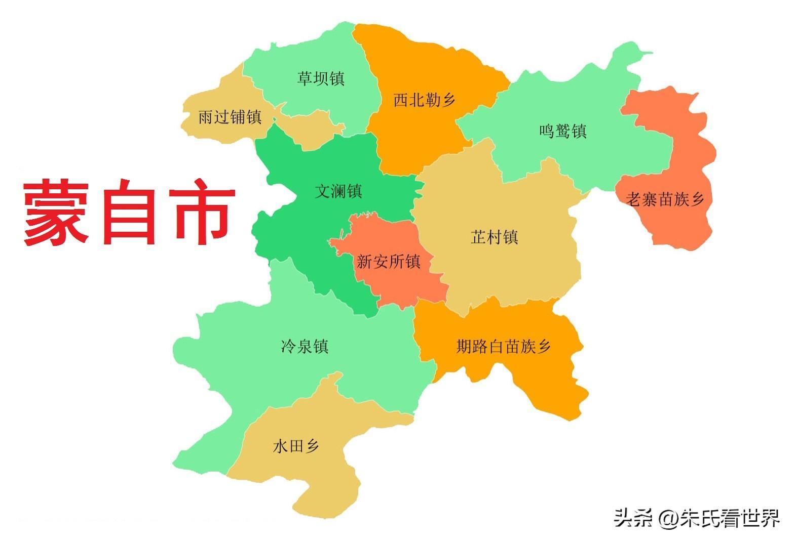 蒙自市,市政府驻文澜街道。位于红河州东部,市境东与文山市相连,南临屏边苗族自治县,西邻个旧市,北接开远市。