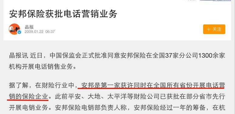 同样的运气,还展现在电话营销业务上,2008年12月,银保监会批准安邦在其37家分公司1300家机构间开展电话营销业务,在全国几十家财险公司里,安邦是第一家被批准在全国范围内开展电销的保司。