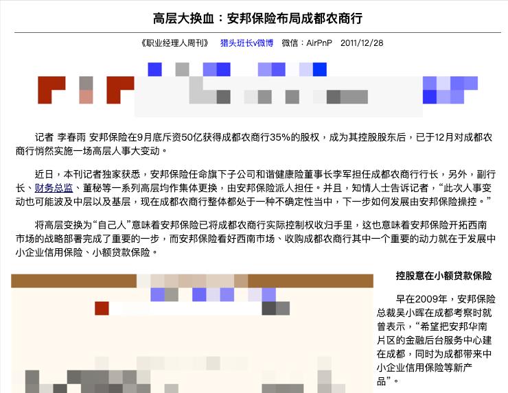 随后,安邦对董事会进行改组,在14人的董事会里占据了6席,完成了对成都农商行的绝对控制。