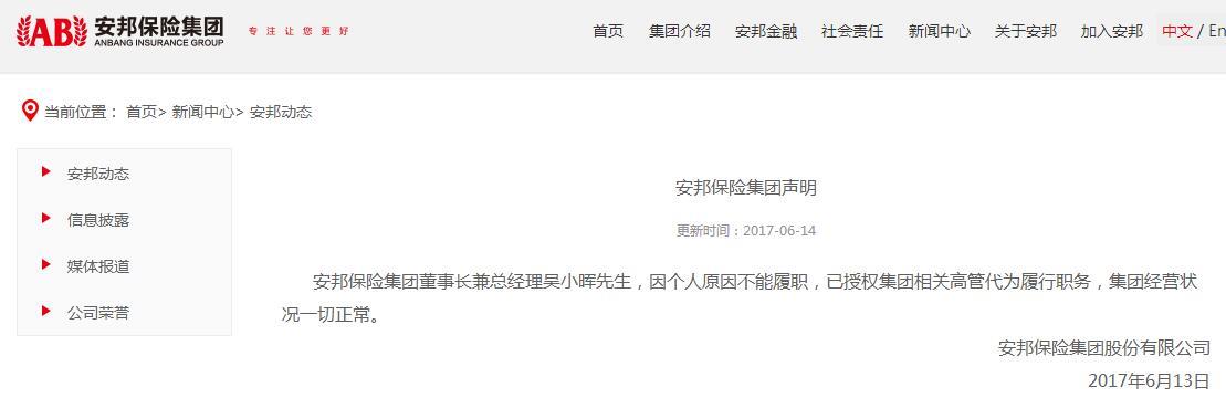 2017年6月,没有任何预兆的情况下,安邦集团突然在官网发布了一则公告,表示公司董事长吴小晖因个人原因,暂时无法履职。