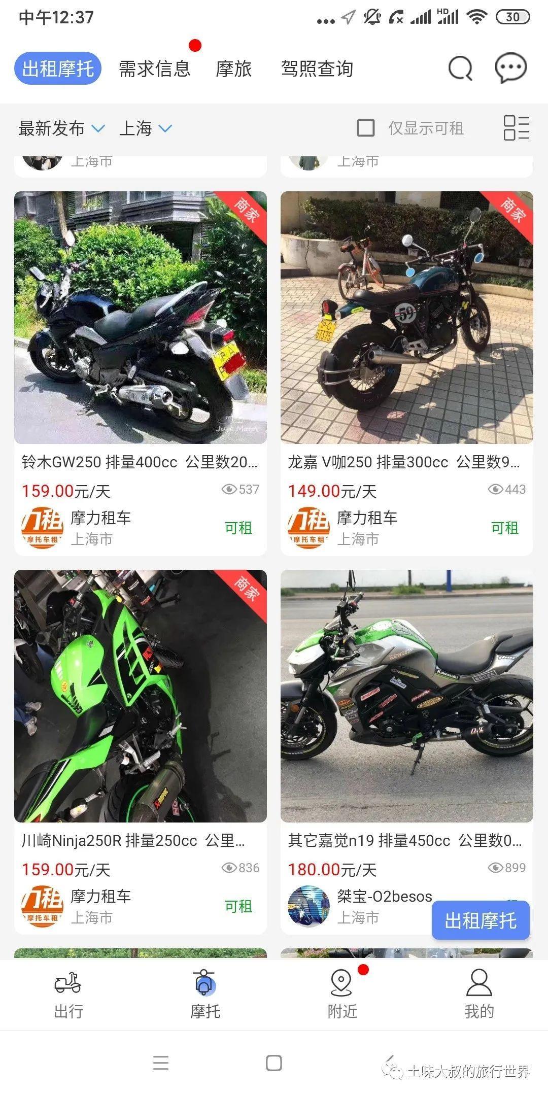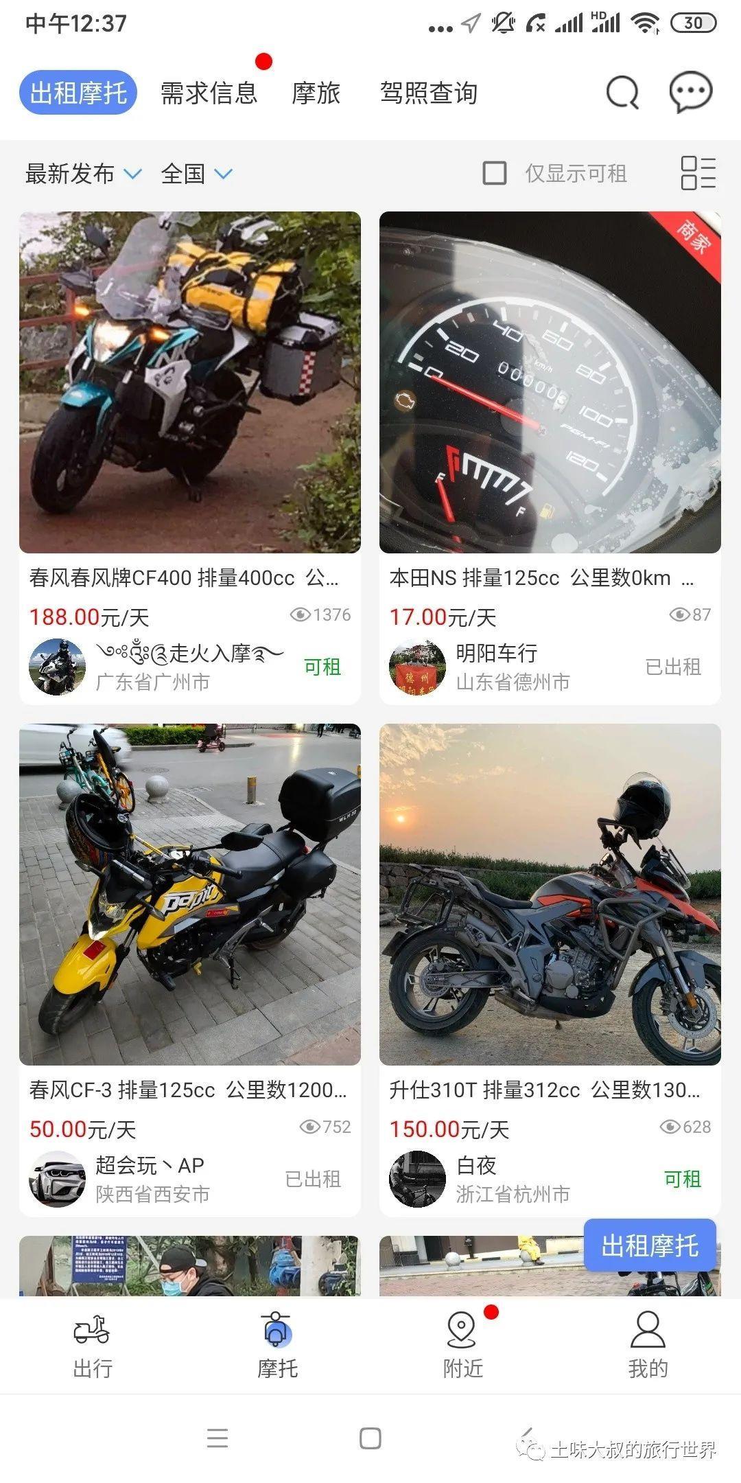 (3)最后压轴介绍的是,国内第一家专业的摩托车租赁平台“MAN共享摩托”APP,我出去摩旅,大部分的摩托车都是从这个APP上租到的。APP里面有几万辆摩托可供出租,里面各种车型都有,绝对能满足你的租车需求。下面是APP打开后的界面,车型价格都已清楚地标示出来(真不是给这个APP打广告,我没有收一分钱广告费,完全是觉得这个APP很实用,就分享给广大想租摩托的网友)。