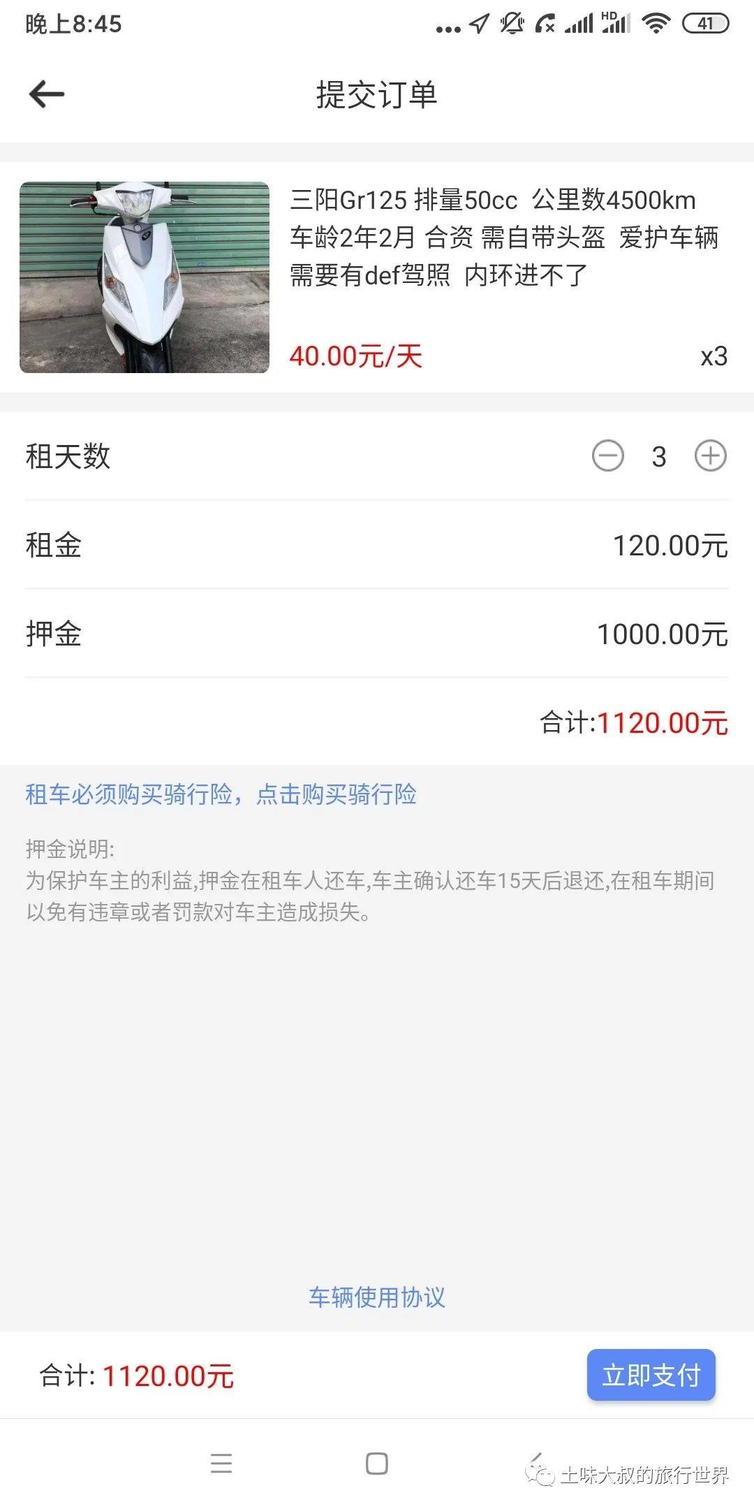 点开其中的一辆摩托,里面的租车介绍非常全面。因此我觉得在咸鱼上租车是比较靠谱,你可以在咸鱼上搜索你所在城市的租车信息,然后联系车主线下见面核实相关情况,谈妥租金和押金、权利与义务。