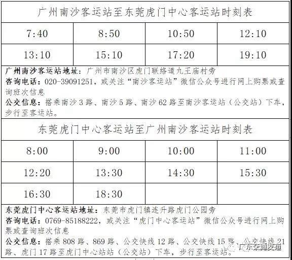 据悉,目前,广州南沙至东莞虎门有固定的客运班线,每天对开,单程票价20元。其中,南沙客运站—东莞虎门中心客运站每天有8个班次,最早7:40,最晚17:10。东莞虎门中心客运站—南沙客运站每天有10个班次,最早8:00,最晚18:30。