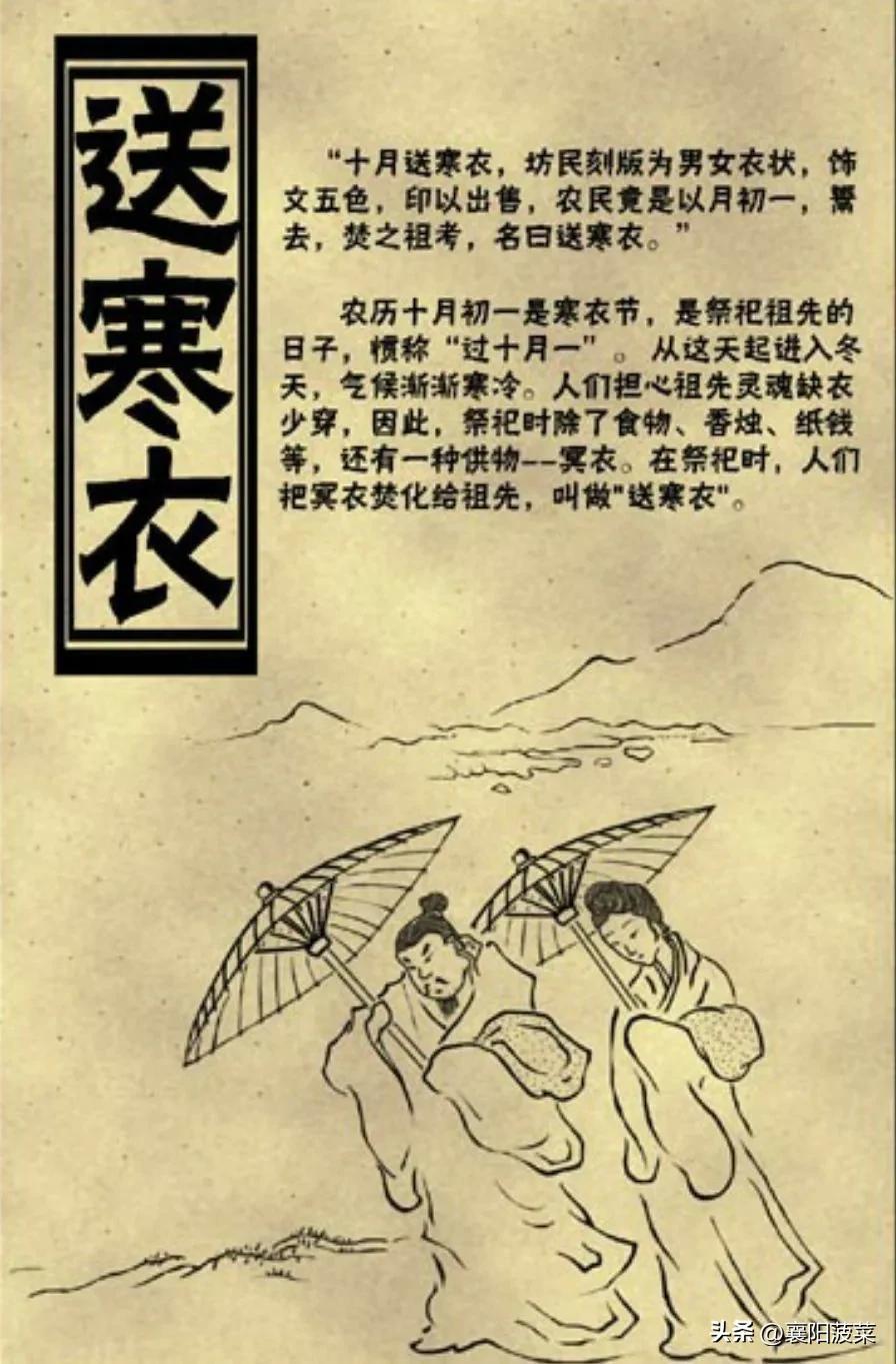 清代《帝京岁时纪胜》:“十月朔……士民家祭祖扫墓,如中元仪。晚夕缄书冥楮,加以五色彩帛作成冠带衣履,于门外奠而焚之,曰送寒衣。”
