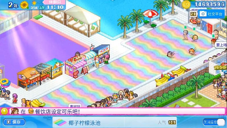 1、经典风格延续:开罗游戏最经典的地方莫过于其像素画风表现出的亲和力,游戏中除了很好地展示了水上乐园风貌:魔性的水上滑梯和翻转水桶当然是乐园标配,但异彩纷呈、温暖堪比温泉、还散发着植物清香的泳池你见过吗?玩家可以尽情地享受各种休闲玩乐与美食畅饮,可以在泳池边吃拉面。