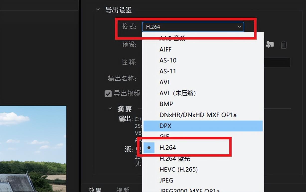 在导出设置中选择导出格式为“H.264”。